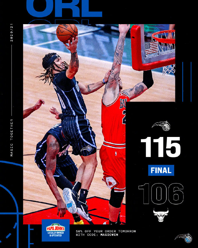 JRS直播网4月15日讯 NBA常规赛,公牛主场迎战魔术。公牛近期遭遇了三连败,目前排在东部第十,领先身后的球队仅两个胜场。魔术更是遭遇了六连败,排名仅高于活塞,列东部倒数第二。一开场,双方均很快进入状态,连续投篮命中,魔术多点开花,领先10分结束首节。次节初段魔术延续火力继续保持领先,后半段公牛突然发力,一波12-3将半场分差缩小到1分。易边再战,武切维奇里突外投帮助公牛咬住比分,无奈魔术火力全开连中四个三分,三节打完魔术领先21分。末节争夺,公牛如梦方醒,拉文连续三分将分差缩小到个位数,恩尼斯三分杀死比赛。最终,魔术客场战胜公牛,结束六连败的同时送给对手四连败。