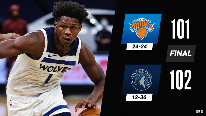 森林狼(12-36):唐斯18分15篮板6助攻,麦克丹尼尔斯18分5篮板3助攻,比斯利17分,爱德华兹20分2助攻3封盖,卢比奥9分7助攻,里德6分3篮板,诺威尔4分6篮板。