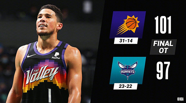 JRS直播网3月29日讯 NBA常规赛黄蜂主场对阵太阳,黄蜂近来状态不错拿到3连胜,太阳则是仍旧高居西部第二。开场后黄蜂外线手感不错连中三分取得领先,布克和艾顿两人轮番拿分带领太阳紧追不舍,但黄蜂多点开花始终保持微弱优势,第二节上来太阳先是打出11-0完成反超。但此后场上局面陷入僵持,场上比分交替上升,半场过后,两支球队打成49平。下半场回来太阳以14-1开局,不过得益于迈尔斯-布里奇斯和科迪-马丁的活跃发挥,黄蜂又将分差缩小到个位数。第四节太阳进攻低迷,格拉汉姆最后时刻连中三分帮助黄蜂打成90平将比赛拖入加时。加时赛中两队仍旧手感一般,不过太阳略胜一筹,最终太阳加时101-97终结黄3连胜。