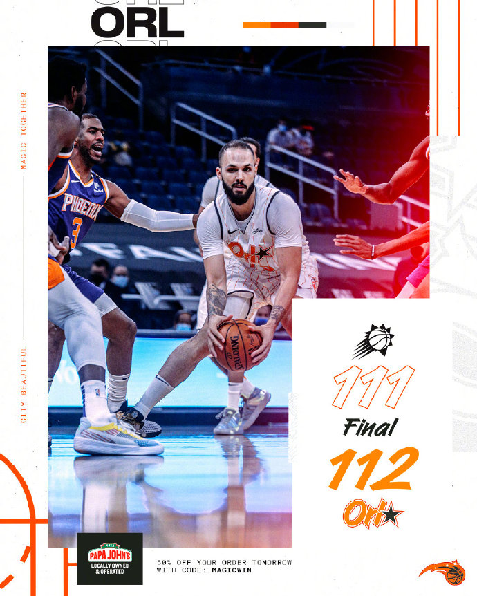 JRS直播网3月25日讯 NBA常规赛,魔术主场迎战太阳,前者最近状态一般2连败已经排在东部倒数第二位,后者则是3连胜已经跃居到西部次席,双方实力还是比较悬殊。开局阶段太阳凭借开局的小高潮建立领先,随后魔术连续的三分帮助追近分差,布克站出来连续中投帮助太阳首节结束领先8分,次节魔术也打出一波进攻波抹平分差,双方展开拉锯战,半场结束双方打平。下半场回来,太阳一波11-0重新建立领先优势,武切维奇苦苦支撑着魔术进攻帮助追分,太阳带领5分优势进入末节,末节魔术打出10-4开局再次反超比分,随后双方展开胶着拉锯战,保罗展现老将风采依靠经验连续取分帮助太阳咬住比分,最后时刻比分交替领先,富尼耶上篮绝杀帮助魔术险胜太阳,终结对手3连胜。