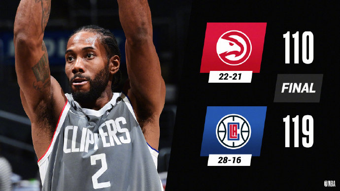 快船(28-16):莱昂纳德25分7篮板5助攻,莫里斯19分2篮板,祖巴茨12分9篮板,乔治8分3篮板7助攻2抢断,曼恩24分10篮板,肯纳德20分7篮板5助攻,帕特森5分。