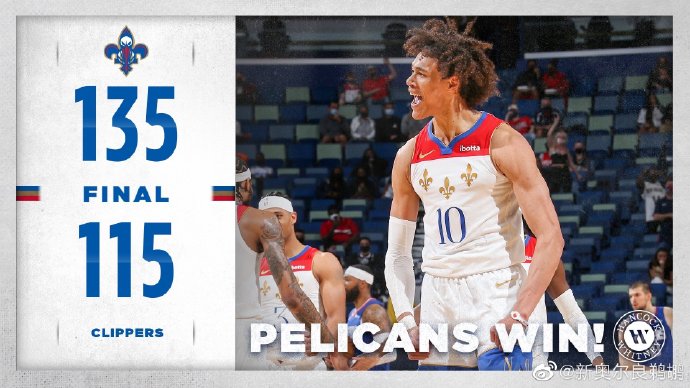 鹈鹕:锡安27分2板5助、英格拉姆23分4板5助、鲍尔20分8板5助、海耶斯17分3板、刘易斯13分3板4助2断、哈特13分5板6助