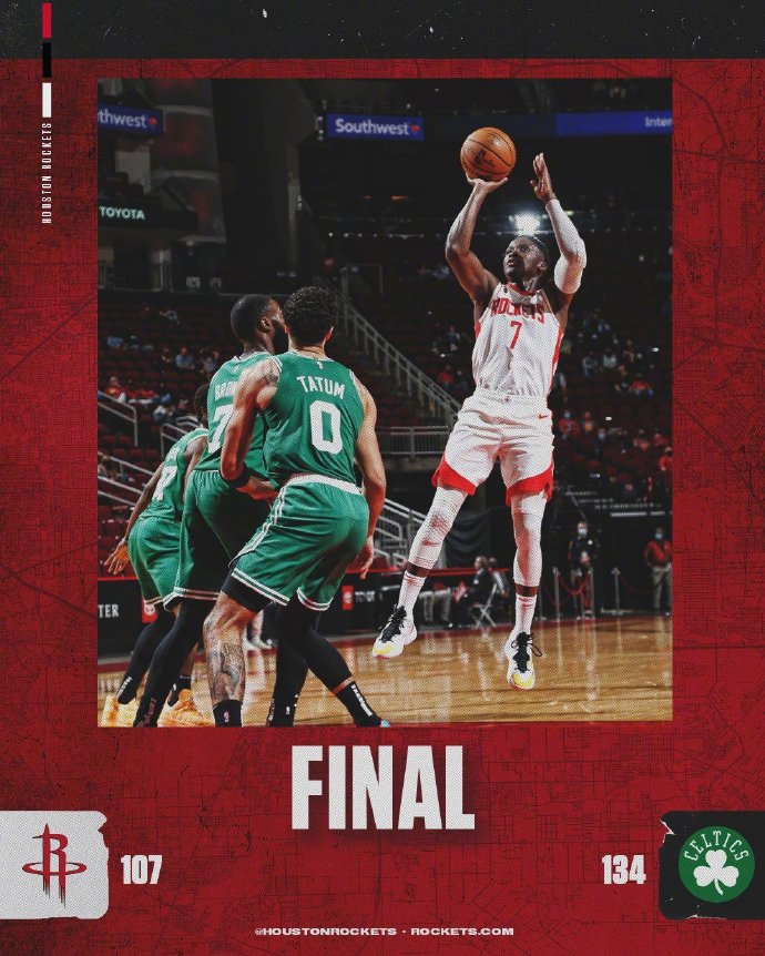 JRS直播网3月15日讯 目前遭遇15连败的火箭坐镇主场迎战凯尔特人,沃尔和戈登本场因伤继续缺阵。上半场的争夺火箭仅仅打了半节时间的好球,他们在奥拉迪波的带领下首节最多拿到8分的领先,但绿军顶住火箭三板斧后迅速占据上风,首节后半段在奥杰莱连续两记三分带动下打出18-6的攻势反超比分,次节开局绿军延续手感又是一波7-0的进攻,而火箭在这一节前6分钟里仅泰特打入唯一的运动战进球,半场结束时绿军已经手握13分领先。第三节火箭仍然没有找回进攻手感,这一节他们仅得19分,而防守端则被绿军彻底打穿,绿军单节再胜19分并将领先拉大至32分早早锁定胜局。最终,凯尔特人客场大胜火箭,并送火箭16连败,16连败也创造了火箭队史连败最长纪录。