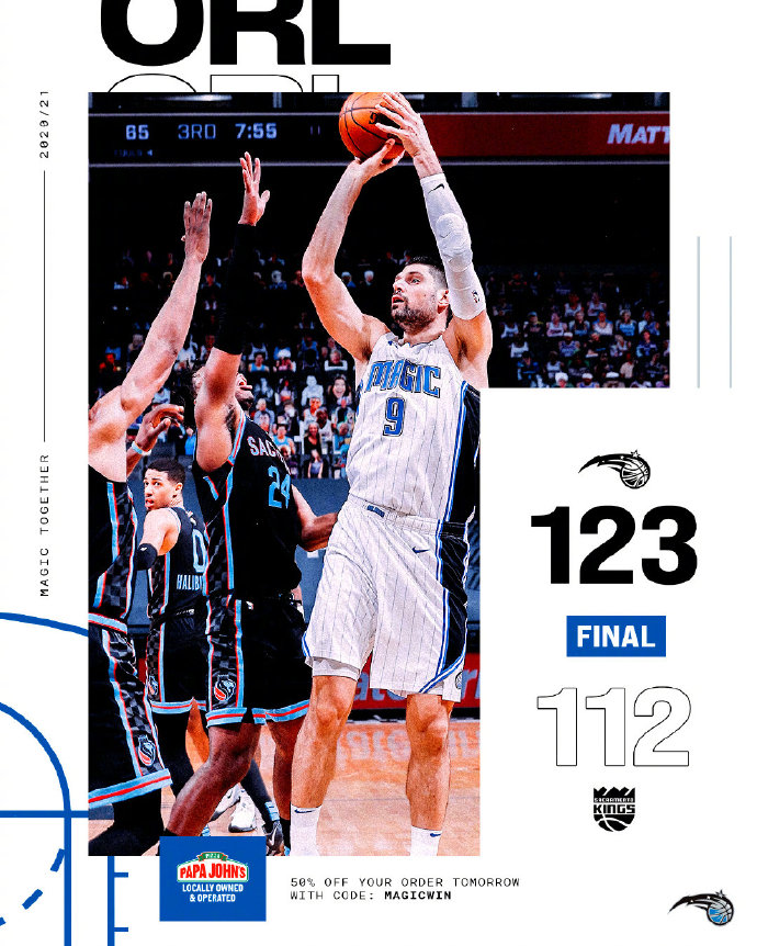 JRS直播网2月12日讯 国王坐镇主场迎战背靠背的魔术,上半场两队打得十分胶着,国王的巴恩斯和希尔德等连中三分,但魔术的武切维奇里外开花频频得分还以颜色,帮助魔术以64-59稍稍领先结束半场。易边再战,迈卡威突然爆发联手武切维奇轮番砍分,两人率领魔术一度取得20分以上领先。国王替补怀特塞德和别利察之后站出来连续得分,帮助球队把分差缩小到10分。不过,魔术及时苏醒过来,武切维奇和罗斯等在末节连续得分,带领魔术重新扩大领先,没有给国王留下翻盘机会。最终,魔术在客场以123-112收获胜利,止住3连败颓势。