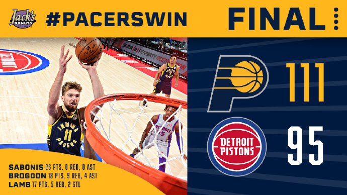 JRS直播网2月12日讯 活塞今日在主场迎战步行者,虽然目前活塞仍然东部垫底,但在此前两场比赛里,他们先是加时负于湖人,后又爆冷击败篮网状态不俗,但本场普拉姆利无法出战,而步行者队则遭遇四连败。本场格里芬开场展现了不错的竞技状态,里突外投连得7分,但活塞全队首节三分7中0,步行者在萨博尼斯的率领下领先9分结束首节。次节活塞推快节奏,约什-杰克逊连续抓住反击机会篮下终结,而格兰特与艾灵顿都有三分入账,步行者这边则失误较多,除萨博尼斯外其它人效率一般,半场打完活塞追平比分。第三节,布罗格登单节拿到10分,而活塞队的进攻重新陷入滞涩,单节步行者赢了活塞12分。末节比赛,活塞进攻并无起色,杰克逊独木难支,最终步行者111-95力克活塞。