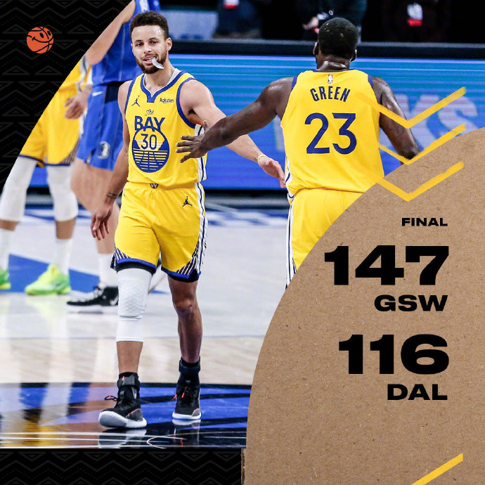 JRS直播网2月5日讯 NBA常规赛独行侠主场对阵勇士,开场后东契奇接连拿分帮助独行侠取得领先,不过勇士多点开花将比分反超,勇士外线手感不错连中三分,不过独行侠迅速调整咬住比分,第二节上来独行侠就打出8-0完成反超,此后东契奇再次发挥帮助独行侠取得领先,上半场独行侠76-74领先。下半场回来波尔津吉斯手感火热连中三分,乌布雷也是状态神勇接连砍分,在第三节后半段勇士打出攻势建立起两位数优势,第四节勇士更是一鼓作气将分差拉大到20分开外,独行侠无力追分,最终勇士147-116大胜独行侠避免连败。