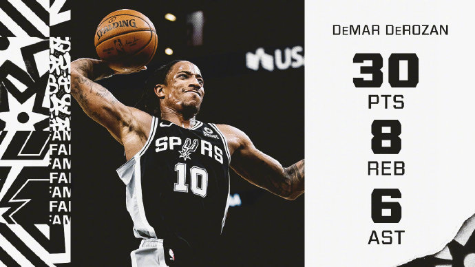 马刺:德罗赞30分8板6助、珀尔特尔19分8板4帽、穆雷15分11板6助、德里克-怀特10分8助