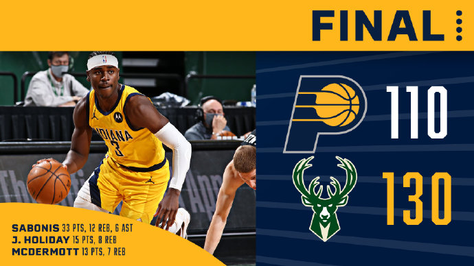 JRS直播网2月4日讯 NBA常规赛雄鹿主场迎战步行者,开场后雄鹿外线手感不错多次命中三分取得领先,第二节两队仍旧大打对攻战,雄鹿逐渐将分差拉大到20分开外,萨博尼斯发力帮步行者略微缩小分差,上半场,雄鹿68-51领先步行者。下半场回来步行者进攻不力只有布罗格登和萨博尼斯两人能够拿分,但雄鹿攻势凶猛多点开花将分差拉大到30分以上,虽然步行者第四节追回些分数,但此前分差过大,最终雄鹿130-110轻松击败步行者取得2连胜。
