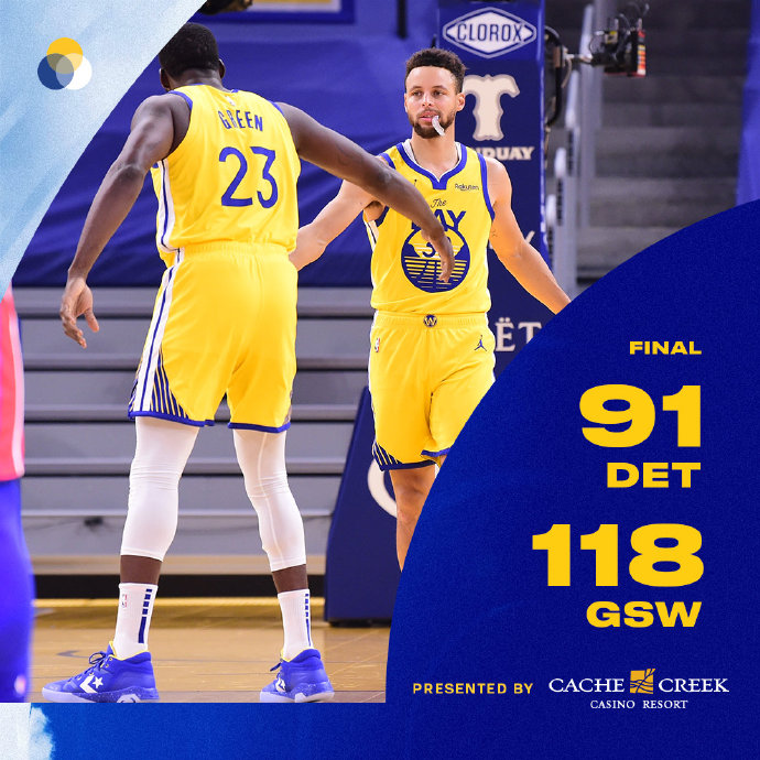 JRS直播网1月31日讯 勇士今日坐镇主场迎战活塞,首节比赛勇士三位核心库里、维金斯和乌布雷合力砍下23分,活塞则进攻断断续续完全找不到感觉,勇士首节便取得12分领先,次节活塞进攻端虽然有所回暖但勇士手感更热,节中勇士一波14-3的攻势一度取得23分领先,半场结束时勇士就以64-45领先活塞。下半场局面依旧,勇士每一节都占据上风不断扩大领先,第三节末段勇士就将领先扩大至30分以上早早就奠定了胜局。最终,勇士大胜活塞迎来最近4场比赛里的第3场胜利。