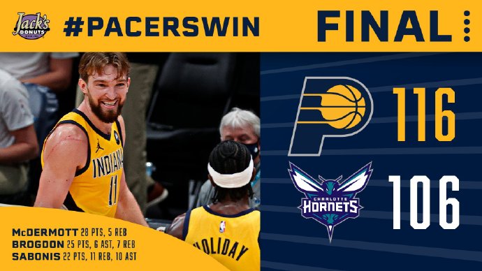 步行者(11-7):麦克德莫特28分5板、布罗格登25分7板5助、萨博尼斯22分11板10助、J-霍勒迪19分6板、特纳8分4板、A-霍勒迪7分。