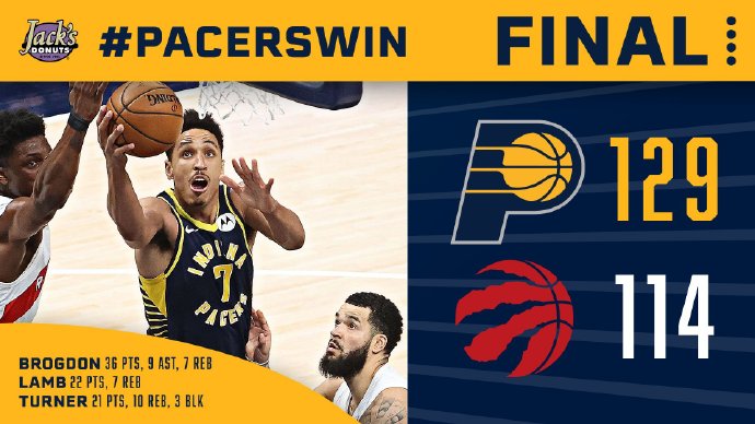 JRS直播网1月26日讯 步行者今日坐镇主场迎战猛龙,猛龙近期6场比赛拿下5场状态迅速回暖,步行者则在近期的4场比赛输掉3场有所滑落。首节比赛步行者凭借一波7-0的攻势占据上风后便一路保持着微弱领先,随后对决猛龙一路追分但打的很被动,布罗格登在第二节末段独砍10分带队拉开比分并手握10分领先。下半场双方一直对攻谁都没能占得便宜,猛龙仅在第四节初短暂反超过比分,但随后步行者众将合力很快扭转局势,节末9-2的攻势将分差拉大至10分奠定胜局。最终,步行者力克猛龙拿下比赛。