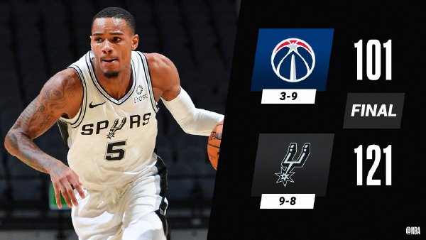 马刺(9-8):穆雷11分11篮板10助攻,沃克16分2抢断,约翰逊13分4篮板,德罗赞9分3篮板8助攻,阿尔德里奇15分2篮板,瓦塞尔14分4篮板,盖伊13分6篮板,米尔斯21分4篮板。