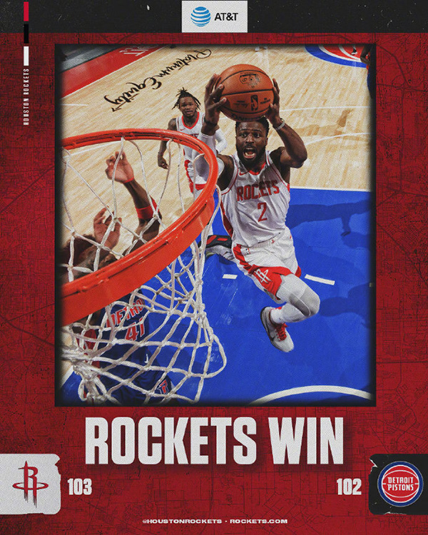 JRS直播网1月23日讯 火箭前往客场挑战活塞,此役沃尔和伍德因伤缺阵。首节火箭迅速找到手感,考辛斯、塔克和泰特等连中三分,帮助火箭建立起两位数领先。不过,活塞之后进入状态,格兰特、艾灵顿等里外开花连续砍分,率领活塞在第三节成功反超比分。末节活塞未能延续手感突然哑火,火箭趁机重新夺回领先。比赛最后,格兰特连续砍分率领活塞追分争取绝杀机会,可惜最后一攻突破上篮超时无效。最终,7人上双的火箭以103-102惊险获胜,止住3连败颓势。