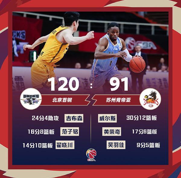 JRS直播网1月16日讯 CBA常规赛今日继续进行,北京对阵江苏,首节比赛北京就展现出了强大的进攻火力,凭借在内线的优势保持大比分领先,首节结束北京38-22领先江苏,次节再战,北京继续依靠自己的内线优势扩大领先,随后外线火力全开,分差来到30分以上,本节后半段北京保持优势,江苏只能凭借外援威尔斯的零敲碎打得到分数,半场结束,北京78-44领先江苏。易边再战,北京外线失准,江苏趁机打出一波11-0缩小差距,此时汉密尔顿站出来稳住局势,两队分差在三十分上下浮动,来到本节末段北京外线再度开火扩大优势,三节结束,北京102-65领先江苏。最终决战,面对北京内线优势,江苏无计可施,随着本节中段王晓辉又一记三分入网,分差来到40分,随着时间推移,比赛早早失去悬念,最终全场比赛比赛结束,北京120-91大胜江苏止连败。