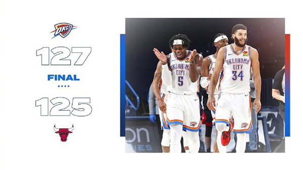 JRS直播网1月16日讯 NBA常规赛继续进行,近期两连败的雷霆客场挑战三连败的公牛,霍福德因为个人原因缺席,而公牛这边则悉数出战,首节一上来两队外线火热对飚,公牛多点开花确立优势,首节结束时他们暂时领先8分,次节回来,公牛外线手感火烫,末段他们再次打出8-0小高潮,半场战罢,公牛已经领先18分。易边再战后公牛连中三分继续扩大优势,但中段多特突然爆发单节独得15分,末段公牛多点开花稳住局势,三节结束时公牛继续领先8分,末节上来后亚历山大单节独得12分并打成关键2+1,雷霆轰出19-3攻击波抹平分差,拉文绝杀三分不中后比赛进入加时,加时赛中穆斯卡拉连中三分,拉文和怀特外线回应,拉文最后时刻绝杀三分不中,最终雷霆127-125险胜公牛。