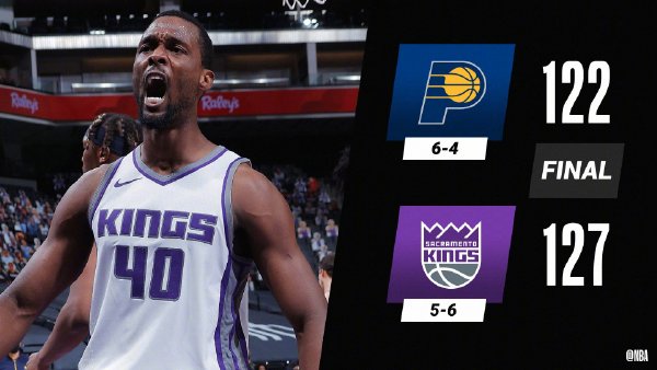 国王(5-6):巴恩斯30分8篮板2助攻1断,霍姆斯16分10篮板3助攻6帽1断,希尔德18分4篮板3助攻,福克斯21分9助攻5篮板,哈利伯顿12分3篮板4助攻,巴格利8分7篮板2助攻,格伦-罗宾逊7分3篮板2助攻,约瑟夫7分2篮板4助攻,怀特塞德8分2篮板。
