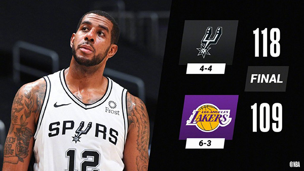 JRS直播网1月8日讯 湖人坐镇主场迎来马刺的挑战,马刺上一场击沉快船结束4连败,湖人则延续状态目前豪取4连胜。上半场的马刺反客为主早早进入状态,凭借着双德首节合力攻下24分,马刺抢得先机取得8分领先,次节湖人仍然阻止不了马刺的进攻,马刺半场高效率命中10记三分,球队凭借出色的内外结合保持9分领先进入下半场。第三节湖人末段发力并送出15-5的攻势抹平比分看到希望,然而他们第四节初又一次哑火,盖伊连砍8分成为关键先生,马刺送出一波11-4的攻势重新取得两位数的领先奠定胜局,最终,马刺客场击败湖人并终结对手4连胜。