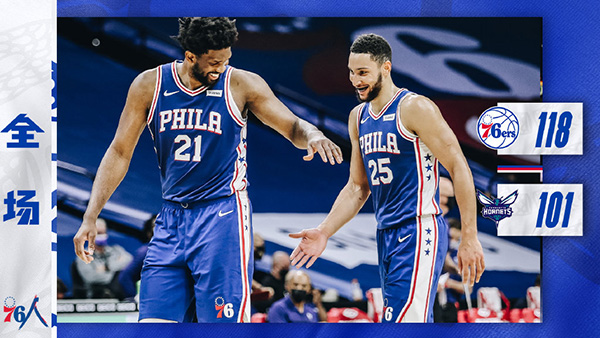 JRS直播网1月5日讯 76人今日坐镇主场迎来和黄蜂的第二次对决,76人在上一场击败黄蜂后凭借5胜1负的开局战绩登顶东部。上半场黄蜂打了一节半的好球,虽然开局落后但一直咬住比分,次节开局他们凭借着4记三分一度反超比分,然而正当他们逐渐控制比赛之际,突然的得分荒打了他们个措手不及,在开局前4分10秒里拿到13分的情况下,随后的7分50秒里黄蜂仅得到7分,而76人内外开花送出27-7的攻势一举反超15分结束上半场。易边再战在黄蜂只在第三节初将分差缩小至个位数,但这之后76人万箭齐发彻底接管比赛,末节开局不久便将领先扩大至20分以上早早锁定胜局。最终,76人双杀黄蜂迎来4连胜,同时稳固自己东部第一的位置。