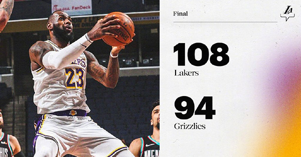 JRS直播网1月3日讯 湖人继续展开西南客场之旅,今天前往孟菲斯挑战伤兵满营的灰熊,此役波普和卡鲁索缺阵,库兹马首发登场。首节灰熊手感火热,琼斯、贝恩和狄龙-布鲁克斯连中三分,帮助灰熊打出一波17-0的高潮建立起两位数领先。但灰熊在次节命中率突然暴跌,湖人则找到手感,哈雷尔、浓眉哥和施罗德等轮番冲击内线得分,湖人在半场结束时以56-54反超比分。易边再战,两队在第三节打得难分难解、场上比分紧咬。不过,詹姆斯在末节开启进攻模式独砍13分,带领湖人打出一波流拉开比分。最终,6人得分上双的湖人以108-94击败灰熊,取得3连胜。