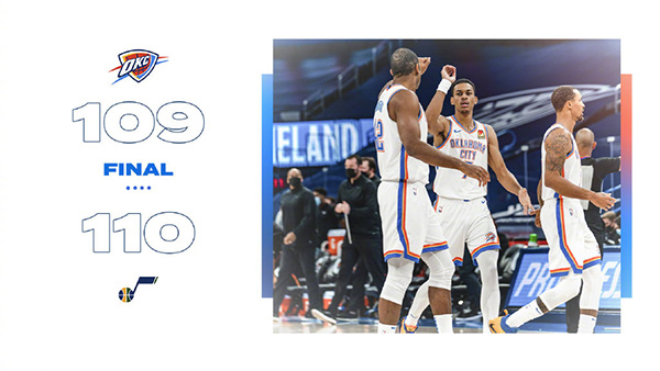 JRS直播网12月29日讯 雷霆坐镇主场迎战爵士,此役两队打得十分胶着,场上比分一路紧咬,悬念一直留到最后。雷霆的多特在比赛最后1分钟命中三分,帮助雷霆反超1分。不过,米切尔在时间还剩7秒时强突得手,爵士重夺领先。最后一攻亚历山大突破上篮不中,雷霆以109-110惜败。