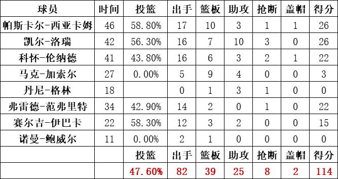 猛龙:凯尔-洛瑞26分7篮板10助攻;科怀-伦纳德22分6篮板3助攻;帕斯卡尔-西亚卡姆26分10篮板;弗雷德=范弗利特22分;塞尔吉-伊巴卡15分。