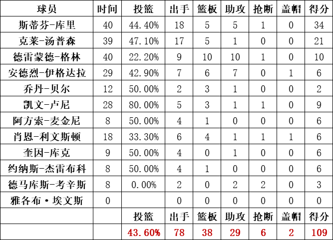 勇士(0-1):库里34分5篮板5助攻、克莱-汤普森21分5篮板、德雷蒙德-格林10分10篮板10助攻、伊戈达拉6分6篮板7助攻、贝尔2分3篮板、卢尼9分3篮板、利文斯顿6分4篮板、库克6分、麦基尼6分、杰雷布科6分、考辛斯3分2助攻。