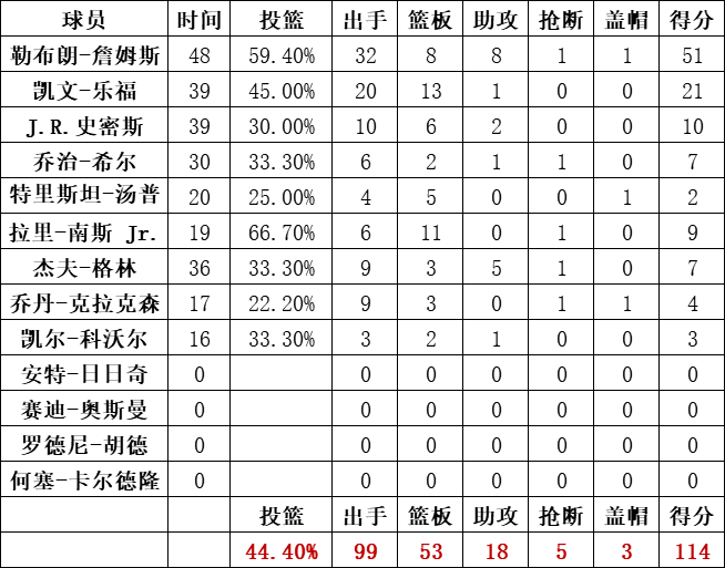 很可惜,骑士还是输掉了比赛。但是,詹姆斯虽败犹荣。在33岁的年龄出战48分钟,32投19中(三分球7中3)、罚球11中10,詹姆斯这样的效率真的很高了。只可惜,在下半场和加时赛中,詹姆斯没有得到队友足够的帮助。