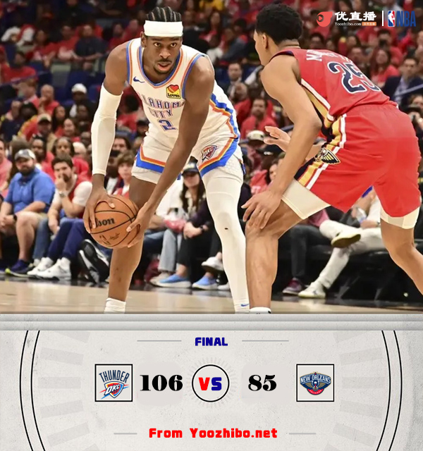 JRS直播网4月28日讯 NBA季后赛,雷霆客场挑战鹈鹕。目前总比分雷霆2-0领先。比赛开始,双方开场势均力敌,比分交替领先,雷霆内外开花占据主动,次节前半段双方依旧缠斗,此后雷霆突然发力,三分4连击将分差拉开到两位数,半场战罢雷霆60-46领先14分。易边再战,雷霆牢牢占据场上主动,又是三分3连击扩大优势,鹈鹕强攻内线拿分苦苦支撑,末节雷霆持续发力打出10-2将分差拉开到20分以上,鹈鹕大势已去无力回天。最终,雷霆106-85再胜鹈鹕,总比分3-0领先拿到赛点。