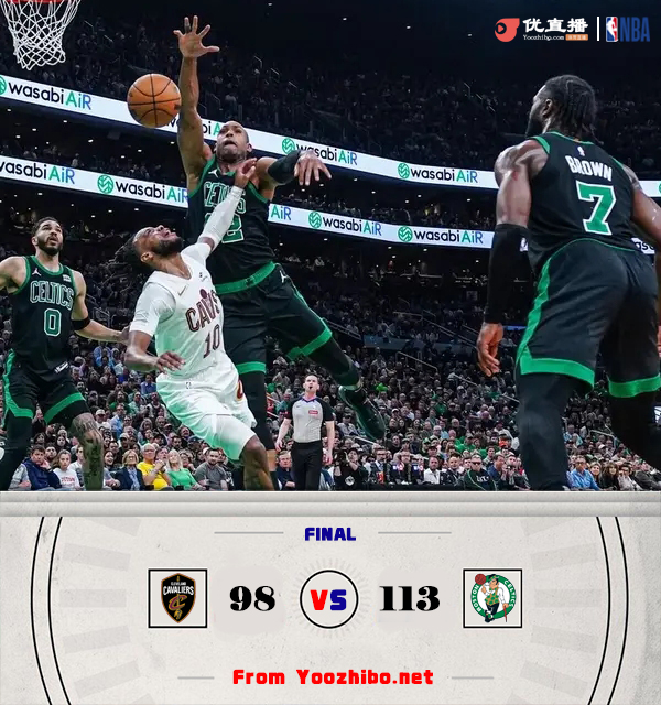 JRS直播网5月16日讯 NBA季后赛东部半决赛G5,凯尔特人回到主场迎战骑士,由于在克利夫兰的两场比赛绿军全部拿下,目前凯尔特人3-1拿到赛点。本场比赛,米切尔和阿伦继续缺阵,勒韦尔也不打。比赛开始,双方接连从外线打开局面,怀特状态火热单节得分上双,而小莫里斯也成为替补奇兵,弹无虚发给出回应,比分一直拉不开,首节双方打成28平,次节双方再次在外线展开对飚,小莫里斯继续保持不错手感,霍福德、怀特和塔图姆接连4记三分帮助绿军反超比分,半场凯尔特人领先6分。下半场,霍福德联手塔图姆打出11-0进攻波一举建立双位数领先,小莫布里接连攻击内线连砍9分止血,塔图姆再站出来回应,第三节双方又近乎打平,末节小莫布里和小莫里斯一内一外继续追分,但怀特、霍福德和塔图姆各自扔进三分强势回应并再次拉开比分,随后绿军牢牢保持住10分左右领先,最终凯尔特人113-98力克骑士,总比分4-1晋级东决。