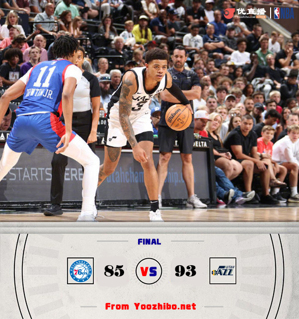 JRS直播网7月11日讯 NBA盐湖城夏季联赛,76人对阵爵士。一开场,双方势均力敌,比分始终紧咬,爵士内外开花,76人连投带罚打出8-0迅速回应,次节阿鲁玛三分吹响球队进攻的号角,76人持续发力扩大领先,爵士不断冲击篮筐努力追赶,康西尔飙中三分,半场战罢76人44-34领先10分。下半场,爵士大举反击,多点开花不断迫近比分,森萨博反击暴扣带队反超,末节双方争夺陷入白热化,比分交替领先,关键时刻爵士连投带罚确立优势,76人苦苦追赶无果。最终,爵士93-85力克76人。