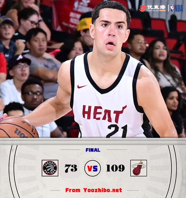 JRS直播网 7月20日讯 NBA夏季联赛,猛龙对阵热火。开场后热火进攻打得顺风顺水,猛龙不仅手感冰凉还失误不断,首节热火32-7净胜25分。第二节热火外线手感依旧火热,他们三分雨下继续将分差拉大。下半场虽然猛龙进攻找回些状态,但热火依旧牢牢掌握场上局面没有给猛龙缩小分差的机会,最终热火109-73大胜猛龙。