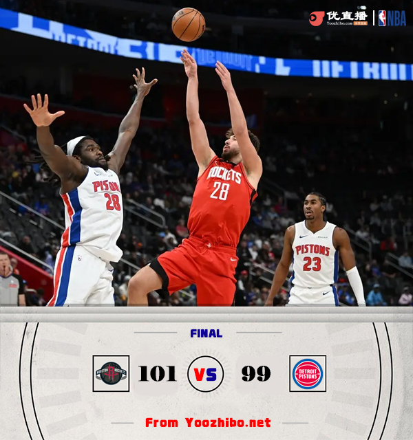 JRS直播网11月11日 NBA常规赛,活塞主场迎战火箭。比赛开始,火箭上来反客为主打出11-2不错开局,CC和艾维接连冲击内线追分,双方后半节命中率急剧下降,首节火箭领先3分,次节活塞上来就发力一波小高潮直接反超比分,狄龙突破终于止住颓势,双方展开拉锯战,活塞始终保持微弱领先并在半场反超2分。下半场,双方命中率还是不高,但比分还是很胶着,范弗里特里突外投一度反超比分,最后3分钟火箭突然发力打出10-2小高潮取得8分领先,末节小哈达威联手比斯利接连3记三分带队轰出16-3攻击波再次反超比分,比赛进入白热化,火箭连续冲到前场篮板补篮领先到5分,哈里斯三分续命后关键传球失误,申京关键两罚中一,火箭采取“点球”战术,哈里斯绝平罚篮第一罚就不中,最终火箭101-99险胜活塞。