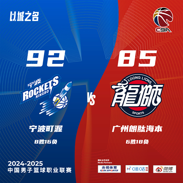 JRS直播网讯北京时间12月30日讯 CBA常规赛,宁波今日迎战广州,前者上场比赛不敌青岛,后者更是状态糟糕已经七连败。比赛上来,广州率先拿到两分后宁波连拿六分取得领先,分差也是拉开到两位数,整个第一节广州的进攻都不好只拿到16分,次节广州的表现依旧没有好转,场上分差不减反增,半场结束时宁波领先14分;下半场回来,两队的命中率仍然很低,不过宁波始终占据着场上的主动权,广州无法获得迫近比分的机会,末节广州一度将分差追到个位数但终究无法实现逆转,最终宁波轻取广州,送给后者八连败。