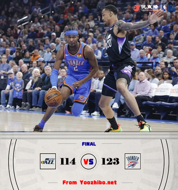 JRS直播网讯 1月23日 NBA常规赛,雷霆主场迎战爵士,雷霆已经主场12连胜,35胜7负高居西部榜首;爵士则是3连败后10胜31负西部垫底。比赛开始,双方都迅速进入状态,爵士接连抢前场篮板连续内线攻进取得领先,但自身接连失误,亚历山大开场手感一般迅速调整,首节轰15分带领雷霆首节反超2分,次节雷霆发力打出小高潮取得领先,马尔卡宁找到手感得分上双回应,爵士全民皆兵半场追到差2分。下半场,爵士内线还是占优,双方比分交替领先,亚历山大接连突破造杀伤,单节再轰18分,带队三节领先6分,末节塞克斯顿有攻有传带队再追到差1分,随后双方比分持续胶着,杰伦威强打2+1后华莱士和亚历山大接连三分,雷霆9-0再次拉开比分,最终雷霆123-114力克爵士,豪取主场13连胜。
