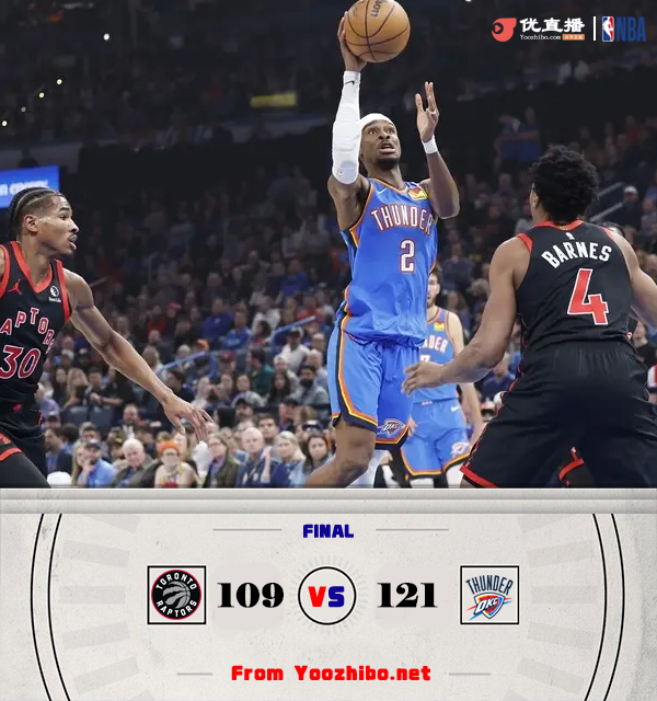 JRS直播网讯 北京时间2月8日讯 NBA常规赛,雷霆今日迎战猛龙,前者近来取得三连胜,后者则是两连败,此役霍姆格伦迎来复出,巴雷特、英格拉姆、珀尔特尔和多特等人缺战。比赛上来,两队打得相对胶着,不过到了首节末段猛龙的进攻突然哑火,雷霆趁势打出一波10-0的小高潮拉开分差,次节猛龙发起反扑连拿九分迫近比分,但雷霆及时给出回应没有给他们反超的机会,半场结束时分差依旧有11分;下半场回来,两队保持拉锯,分差没有发生太多改变,复出的霍姆格伦场上存在感也不是很强,单节再次未得分甚至没有出手,末节猛龙没有再获得任何机会,分差也是进一步突破二十分,最终雷霆轻取猛龙,迎来四连胜的同时也送给后者三连败