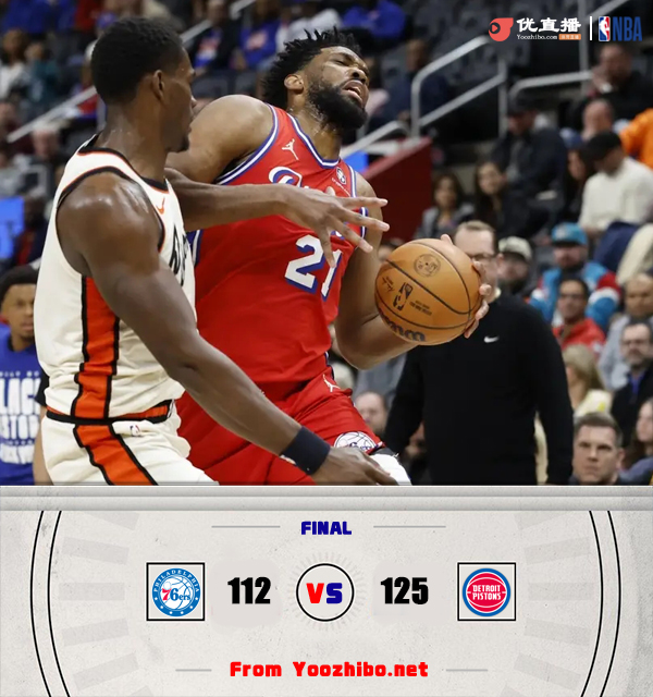 JRS直播网讯 北京时间2月8日讯 NBA常规赛今日继续开打,活塞今日坐镇主场迎战76人,本场比赛76人三位核心久违的全员出战,活塞方面核心康宁汉姆缺阵。首节之争双方状态令人大跌眼镜,三位核心全员出战的76人虽然保持不错的进攻状态但防守端完全阻止不了对手,而缺少核心康宁汉姆的活塞则多点开花,他们单节命中7记三分爆砍42分的同时首节就取得15分领先;次节76人依旧无法阻止对手,活塞方面比斯利承担起进攻端重担单节拿下12分,这一节活塞再砍36分,半场轻松拿到78分的同时取得29分的巨大领先。休息归来76人终于找到状态,上半场状态失常仅得3分的恩比德在这一节爆砍20分,不过76人虽然回敬单节39分的攻势但分差仍然很大;末节活塞开局稍显被动但领先优势让他们感受不到太大威胁,后半段则稳住局面重新拉开比分锁定胜局。最终,活塞主场力克76人拿下比赛。