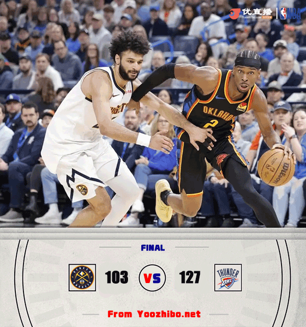JRS直播网讯北京时间3月10日讯 NBA常规赛今天迎来一场强强对话,雷霆主场对阵掘金。雷霆52胜11负高居西部第一,掘金41胜22负排在西部第二。比赛开始,掘金反客为主率先发力,打出10-0的开局,亚历山大连续单打得手带队追赶,此后双方陷入缠斗,掘金多点开花,亚历山大得分助攻一肩挑还以颜色,杰林-威廉姆斯连中三分,布劳恩连得7分迅速回应,半场战罢雷霆61-60领先掘金1分。易边再战,亚历山大和霍姆格伦先后打成2+1带队扩大优势,双方围绕10分左右分差展开激烈争夺,约基奇和穆雷联手拿分带队追赶,末节雷霆占得先机,连投带罚重获两位数优势,掘金苦追赶无果,最终,雷霆127-103击败掘金,主场过关。