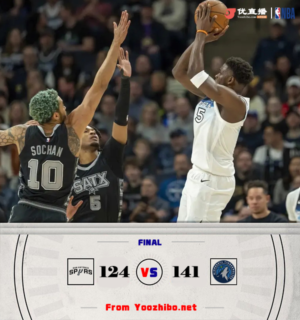 JRS直播网讯北京时间3月10日讯 NBA常规赛,森林狼主场迎战马刺。森林狼4连胜后36胜29负西部第7,马刺则是26胜35负西部第13。本场比赛,戈贝尔迎来复出。比赛开始,马刺开场慢热,麦克丹尼尔斯帮助球队打出不错开局,福克斯和瓦塞尔内外线接连止血回应,爱德华兹接连三分命中单节上双,森林狼首节领先8分,次节双方展开对攻战,康利连续三分命中,卡斯尔接连突破回应,里德和福克斯也在外线对飚,双方次节打成31平。下半场,双方继续对攻,马刺多点开花追分,爱德华兹接连突破回应,分差始终保持在10分左右,末段森林狼连续3记三分拉开15分领先,末节森林狼继续发力,戈贝尔接连内线吃饼拉开20分以上领先,随后双方逐渐换上替补练兵,最终森林狼141-124击退马刺,拿到5连胜。