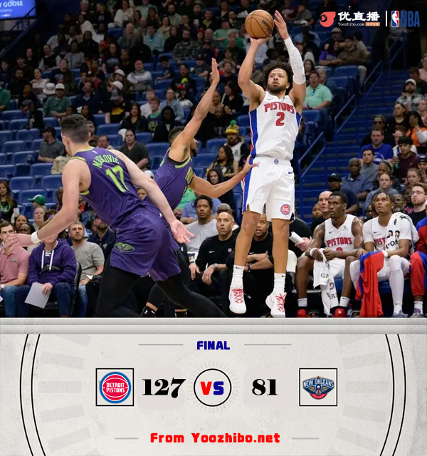 JRS直播网讯北京时间3月18日讯 NBA常规赛,鹈鹕主场迎战活塞,鹈鹕18胜50负西部第14,活塞37胜31负东部第6,两队目前都是2连败。比赛开始,墨菲上来就手腕受伤回更衣室,活塞首发五虎多点开花打出17-7开局,随后活塞接连扣篮继续扩大领先,鹈鹕首节仅得13分落后到22分,次节康宁汉姆带领活塞继续发力拉开30分以上领先,锡安和麦科勒姆始终找不到手感,阿尔瓦拉多外线7中0,半场活塞领先31分。下半场,活塞进攻端受阻半节未上双,锡安带队接连攻击内线追至20分以内分差,胆康宁汉姆能站出来回应,三节活塞依然领先25分,末节丰泰基奥连中三分助队重新拉开30分以上领先,双方换上替补练兵,活塞扩大到40分以上领先,最终活塞127-81大胜鹈鹕,送对手3连败。
