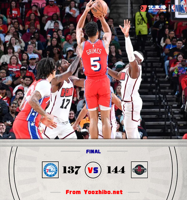 JRS直播网讯北京时间3月18日讯 NBA常规赛今日继续开打,火箭今日坐镇主场迎战76人,76人伤兵满营本场多达11人受伤缺席比赛。首节对决双方状态都出人意料,防守效率联盟高居第二的火箭首节被伤兵满营的76人轰下44分,进攻端杰伦-格林和狄龙首节合计14中1直接导致落后16分;次节火箭防守端依旧无法阻止对手,76人半场轰进15记三分,命中率超过60%并带着21分领先进入下半场。休息归来杰伦-格林回暖主导进攻,他单节拿下10分的同时送出7次助攻,火箭在第三节以惊人的73.9%命中率狂轰45分并单节抹掉最多25分劣势。末节76人在格莱姆斯的带领下送上10-0的攻势重新确立起领先,火箭无奈再度换上杰伦-格林并稳住局面紧追比分,不过火箭场面惨烈伊森6犯离场外加范弗利特二级恶犯被驱逐,不过被雪藏整个下半场的申京最后补篮自我救赎拖入加时。加时赛申京一扫阴霾上来打成2+1,随后杰伦-格林和小史密斯外线轰进三分确立起主动,格莱姆斯的两记三分为76人咬住比分,不过火箭最后顶住压力守住优势。最终,火箭在最多落后25分的情况下上演极限逆转加时力克76人取得7连胜。
