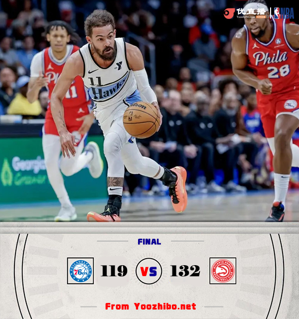 JRS直播网讯北京时间3月24日讯 NBA常规赛,76人对阵老鹰,老鹰最近表现不错取得2连胜,76人则是遭遇3连败。开场后丹尼尔斯连续空切拿分帮助老鹰抢占先机,亚布塞莱和爱德华兹联手为76人咬住比分,随后老鹰外线找到手感接连投进三分将比分拉开。第二节老鹰的轮换阵容依旧活力满满,爱德华兹连续强攻内线为76人追分,老鹰刚刚将分差拉大后又被76人追到12分。易边再战,老鹰上来就掀起攻势将分差拉大到20分以上,老鹰外线手感火热不断轰进三分。最后一节老鹰外线命中率稍有下降,76人通过反击又将分差追到个位数,老鹰在特雷-杨带领下及时稳住局面,场上分差再度被拉开,76人未能再度挽回局面,最终老鹰132-119轻松击败76人取得3连胜,76人遭遇4连败。