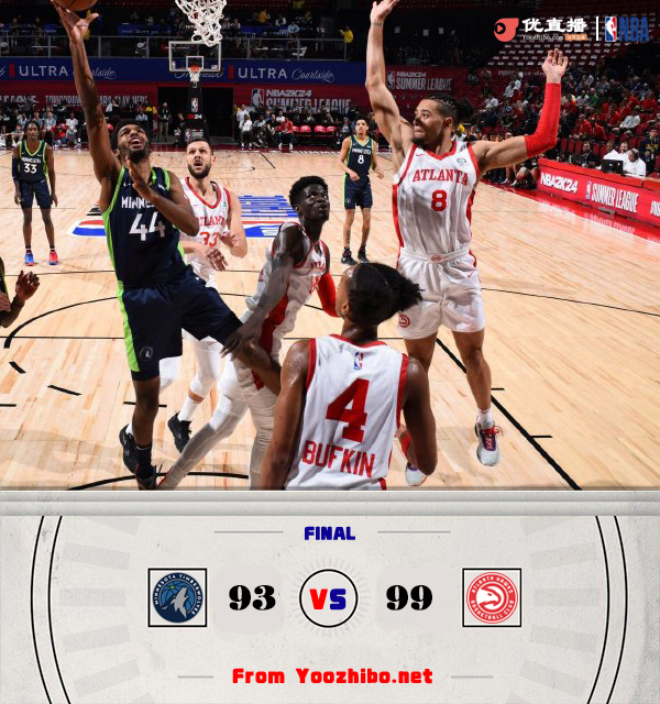JRS直播网讯 7月13日讯 NBA夏季联赛,老鹰对阵森林狼。一开场,森林狼率先发力,连造杀伤开局9-2领先,老鹰轮番冲击篮筐拿分追赶,并且完成7-0的攻势反超比分,森林狼命中率持续下降,老鹰连中4记三分取得两位数优势,半场战罢老鹰50-40领先10分。下半场,双方围绕两位数的分差展开拉锯战,老鹰突然哑火,森林狼火力全开轰出24-7的进攻狂潮,此后老鹰及时回暖完成12-2的攻击波重夺领先,关键时刻泰瑞斯-马丁连投带罚拿到6分,老鹰虽连续罚球失手,但森林狼没能抓住机会。最终,老鹰99-93力擒森林狼。