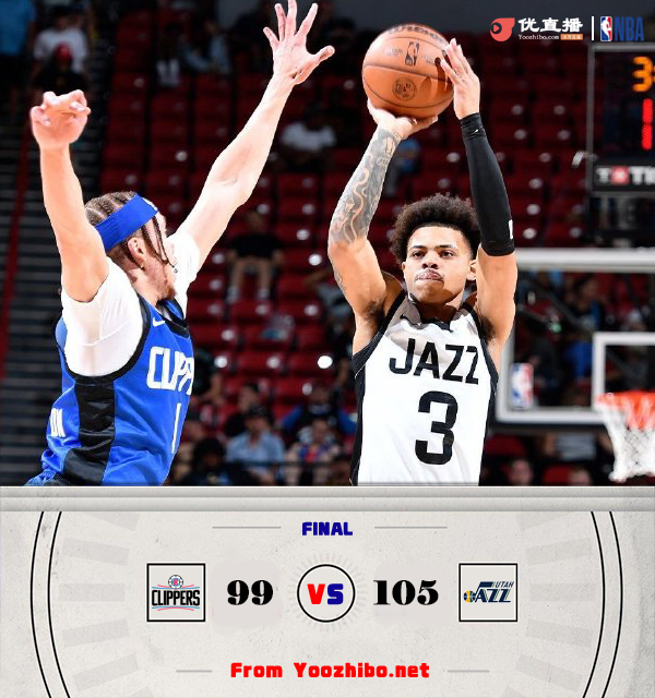 JRS直播网7月9日讯 拉维斯加斯夏季联赛继续进行,快船和爵士直接交锋,爵士这边阿巴基和朱赞领衔,今年的16号秀基昂特-乔治继续出战,快船这边普雷斯顿领衔,今年的30号秀科比-布朗和48号秀乔丹-米勒在列。比赛开始后快船率先发力,普雷斯顿联手迪亚巴特轮番取分,爵士连中三分强势回应,中段两队外线火热对飚,爵士多点开花逐渐拉开比分,首节结束时爵士领先7分,次节回来,两队进攻火力放缓,快船始终无法打出追分高潮,中段爵士外线续上火力继续扩大优势,半场战罢,爵士继续领先10分。易边再战后普雷斯顿率队追分,阿巴基内外结合立刻回应,乔治接连取分,三节结束后爵士依然保有6分优势,末节决战,乔治无人可挡连中三分,单节狂揽17分,阿巴基里突外投继续取分,两人联手率队再次确立两位数优势,末段穆恩连中三分,但无奈追分未果,最终爵士105-99击败快船。