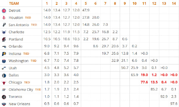 北京时间5月17日上午8点NBA乐透抽签仪式正式在芝加哥举行,本赛季十四支未能晋级季后赛的球队将先后进行抽签,根据选秀规则战绩最差的三支球队抽中状元签的概率都是14%。按照本赛季的战绩活塞、马刺和火箭抽中状元签的概率都是14%,黄蜂12.5%、开拓者10.5%、魔术9%、步行者6.8%、奇才6.7%、爵士4.5%、独行侠3%、公牛1.8%、雷霆1.7%、猛龙1%、鹈鹕0.5%。
