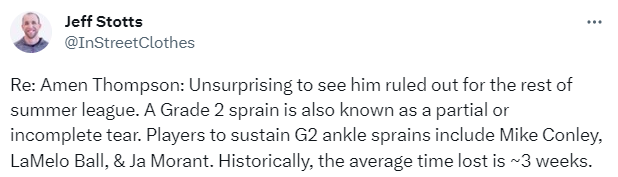 医学专家Jeff Stotts表示阿门-汤普森夏联报销并不奇怪,脚踝二级扭伤也成为部分撕裂,一般二级扭伤至少需要休息3周。