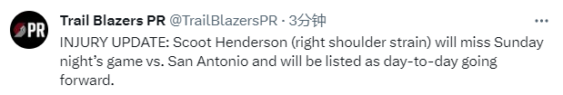JRS直播网讯07月09日波特兰开拓者官方更新斯库特-亨德森的伤情,亨德森的右肩扭伤,将缺席下周一与马刺的比赛,进入球队每日观察名单,探花亨德森无缘下一场大战状元文班亚马;火箭4号秀更惨,脚踝二级扭伤,预计夏联报销。