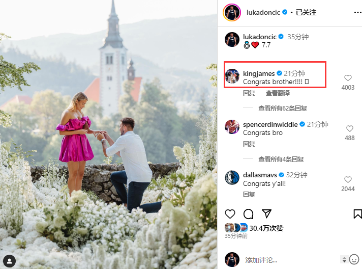 这是一个特殊的日子,东契奇身穿独行侠77号球衣,并且在当地时间7月7日成功求婚,不得不说东契奇用心了;詹姆斯、丁威迪、独行侠官方都在评论区祝贺东契奇,老詹写道:恭喜你,兄弟。