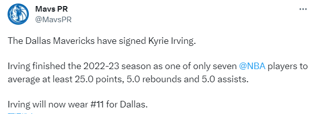 JRS直播网讯07月08日,达拉斯独行侠官方正式宣布与欧文续约,并且宣布欧文新赛季将改穿球队的11号球衣;新赛季,欧文继续联手东契奇冲击总冠军。