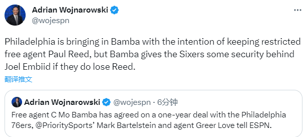 JRS直播网讯07月06日据espn名记woj报道,湖人中锋班巴已经同意和76人签下1年合同,班巴确定离开湖人,新赛季班巴辅佐恩比德冲击总冠军。