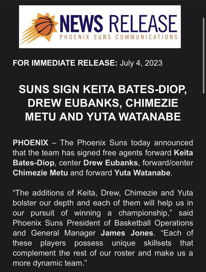 太阳总经理詹姆斯-琼斯声明:渡边雄太、尤班克斯、梅图和迪奥普增加了我们的阵容深度,他们将帮助我们全力赢得总冠军,这些球员中的每一位都拥有独特的技能,可以补充我们名单中的其他球员,使我们更加充满活力。